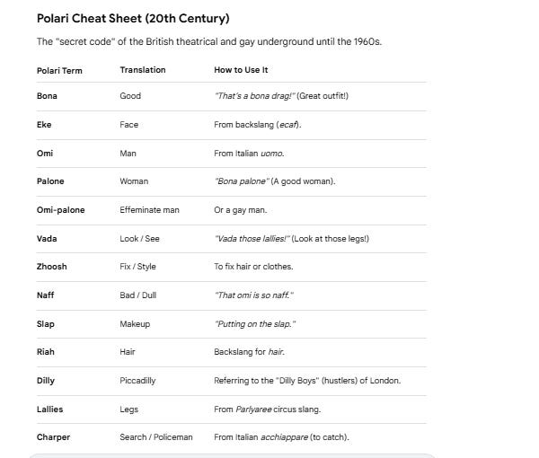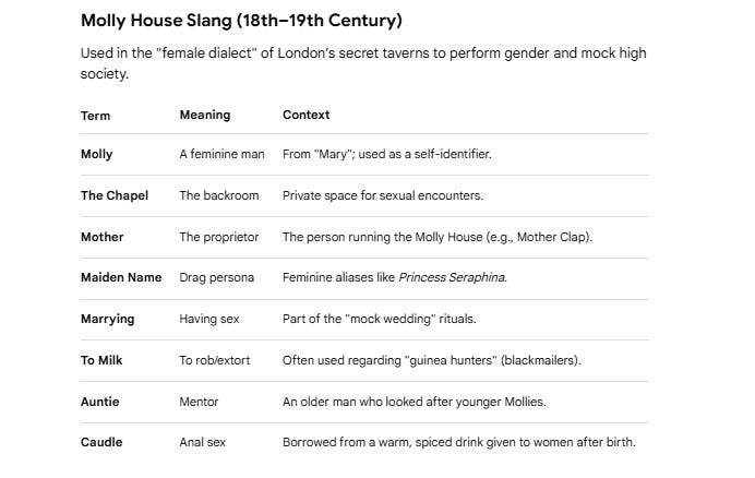 Underground queer circles gathered in Molly Houses and used Polari to speak openly in front of the Lily Law (police).